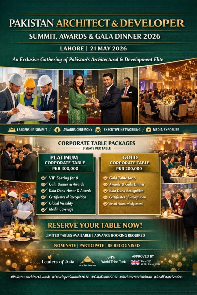 The Pakistan Architects & Developers Summit, Awards & Dinner Gala is positioned as a VVIP, invitation-only national platform recognising excellence across architecture, real estate development, and academia.